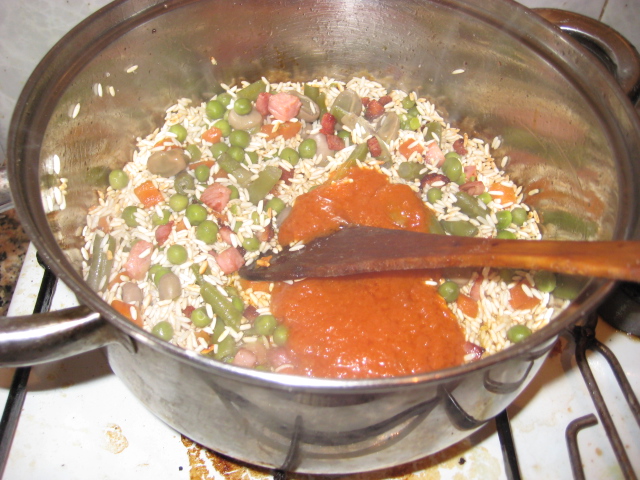 dorado añade la menestra. Remueve bien, añade el tomate frito mezcla bien