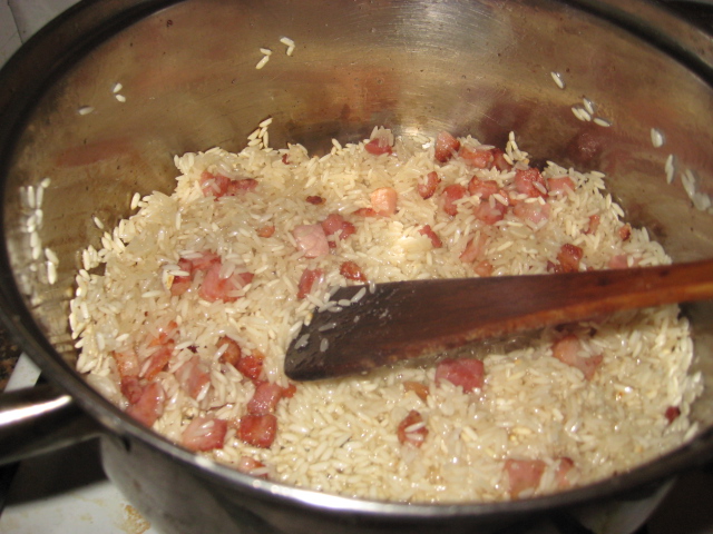 para que coja el gusto del aceite y el beicon. Cuando veas que el arroz está