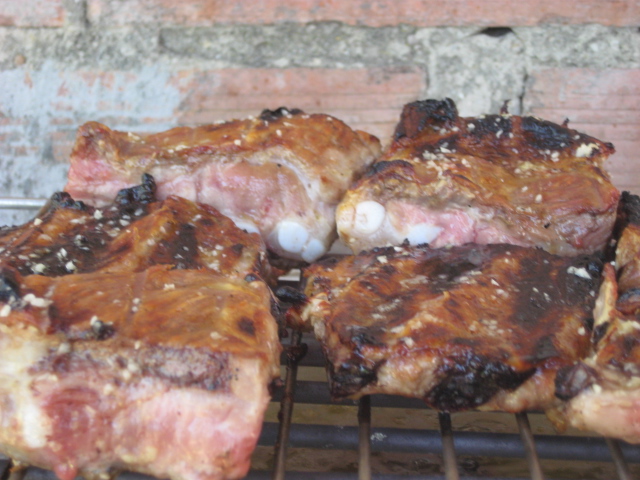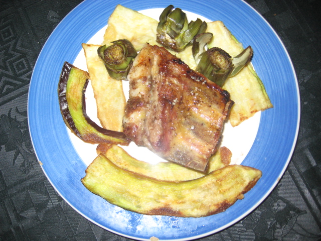 un trozo de costilla por comensal, acompañado con calabacín y berenjena frita.