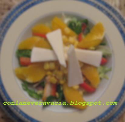el centro pon el maíz dulce. Reparte los gajos de media naranja en cada plato.