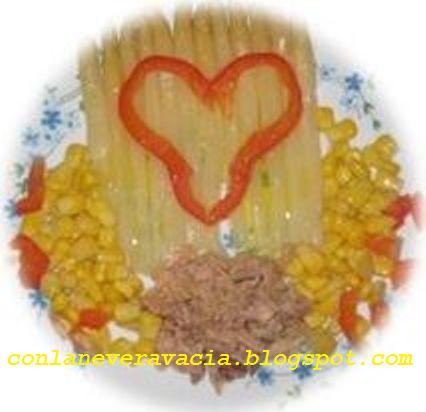 Encima de los espárragos pon la tira de pimiento en forma de corazón. Aliña con