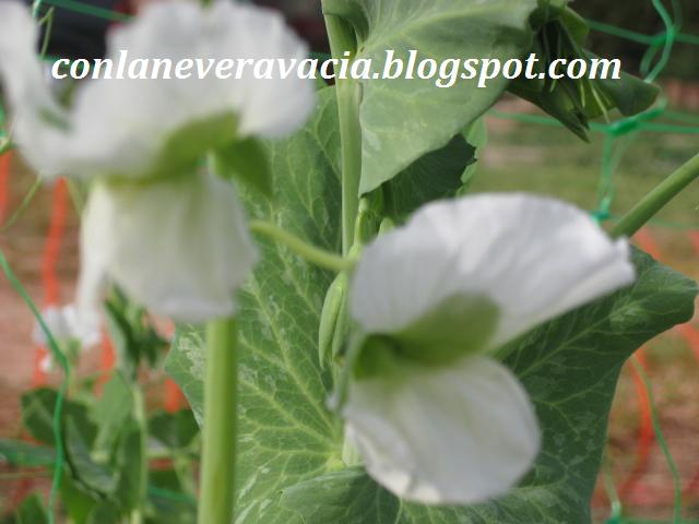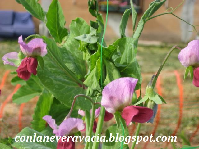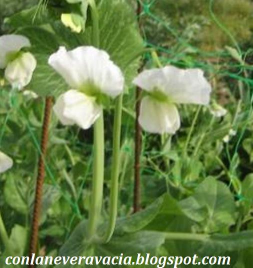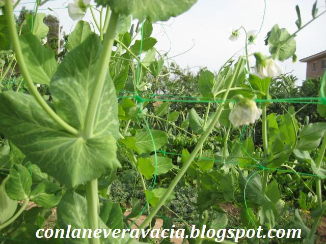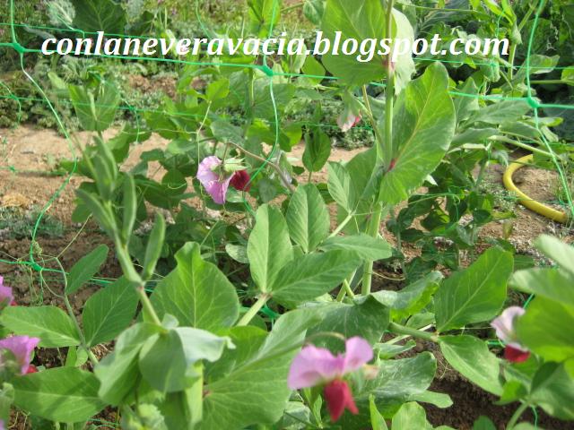mata baja, mata alta y tirabeques. Las plantas están en flor y con el fruto