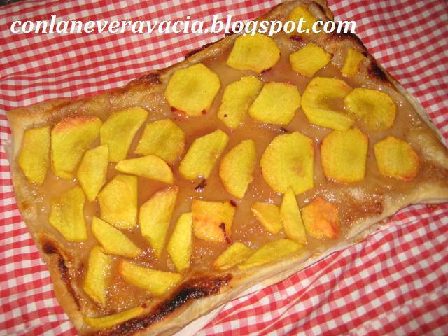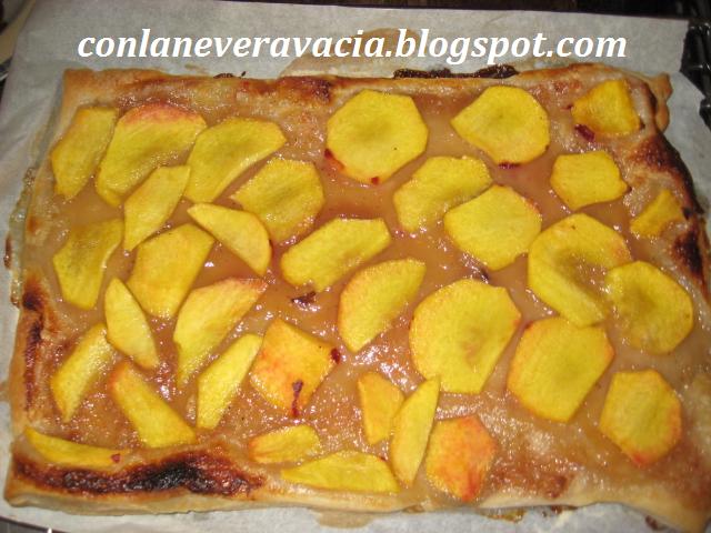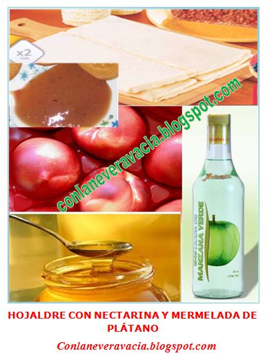 INGREDIENTES: 1 LAMINA DE HOJALDRE DE 250 GR, 2 NECTARINAS, MERMELADADE PLÁTANO, 1 CUCHARADA DE MIEL,1 CUCHARADA DE LICOR DE MANZANA.