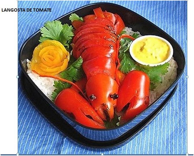 tomate, dándole forma de langosta, la parte de atrás las rodajas más grandes