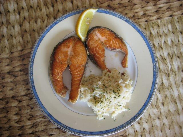 RODAJAS DE SALMON POR PERSONA, ARROZ HERVIDO, SAL, PEREJIL, ACEITE DE OLIVA,