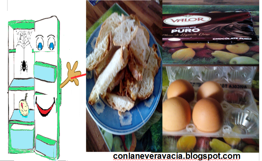: 4 HUEVOS GRANDES,250 GR PAN SECO DEL DÍA ANTERIOR(A poder ser de hogaza o pages de panaderia), 250ML DE LECHE, 6 CUCHARADAS SOPERAS DE AZÚCAR, 100 GR DE CHOCOLATE NEGRO 70% SIN AZÚCAR, 1 CUCHARADA DE VAINILLA. ACEITE